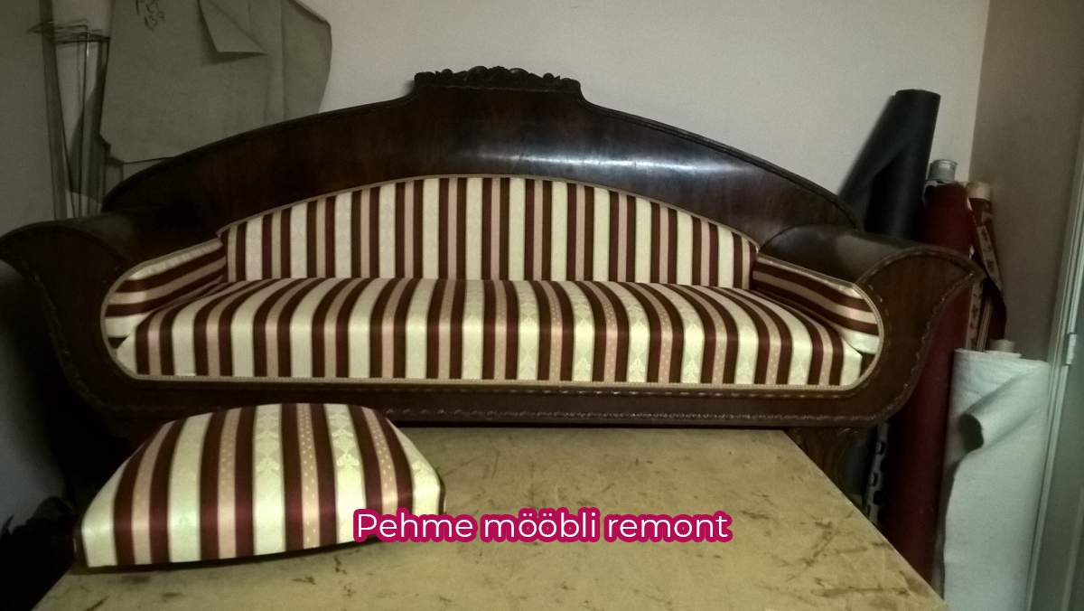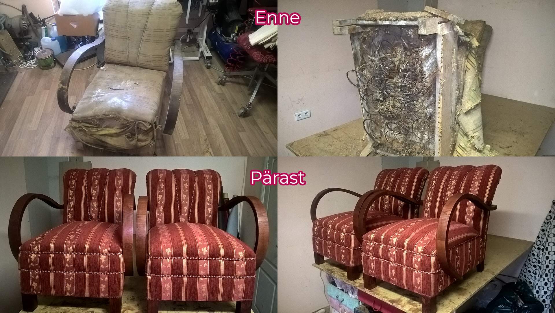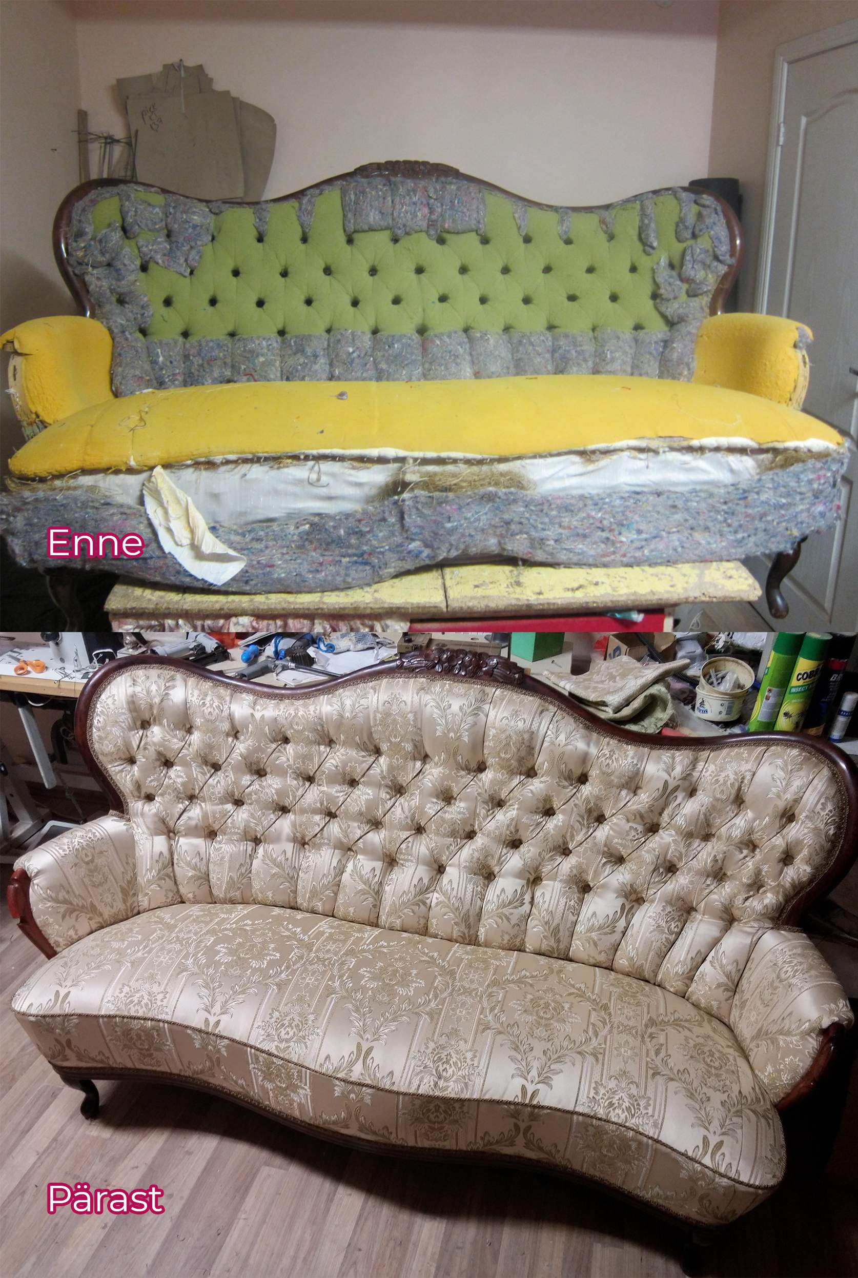 4. Töökojas eemaldatakse vana riie. Vastavalt vajadusele remonditakse või vahetatakse välja vedrud, pannakse uus polster, porolon ja kaetakse uue kangaga. Töö valmides lepime kokku teile sobiva äratoomisaja.