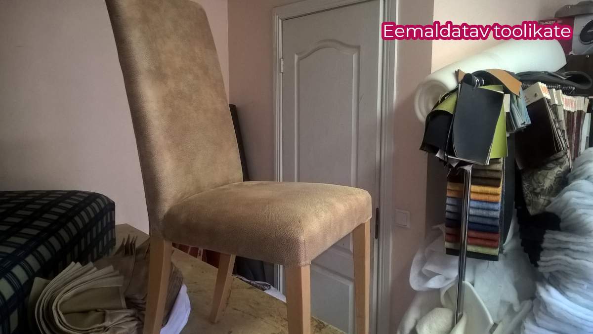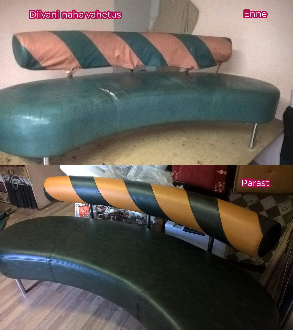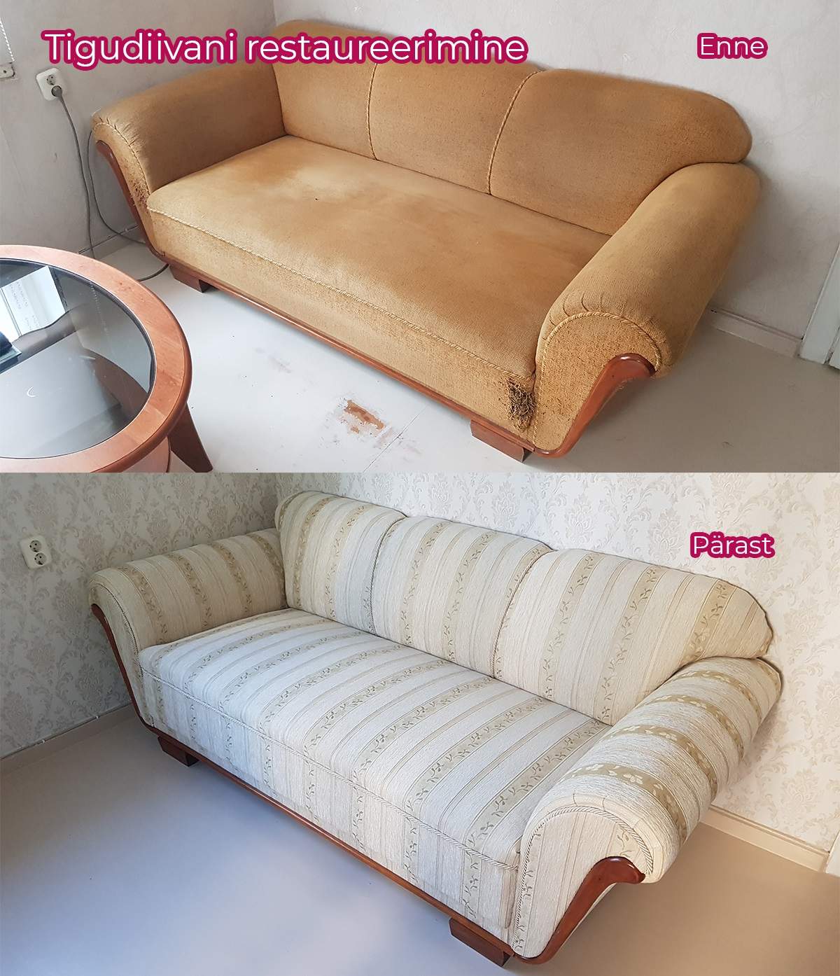 4. Töökojas eemaldatakse vana riie. Vastavalt vajadusele remonditakse või vahetatakse välja vedrud, pannakse uus polster, porolon ja kaetakse uue kangaga. Töö valmides lepime kokku teile sobiva äratoomisaja.